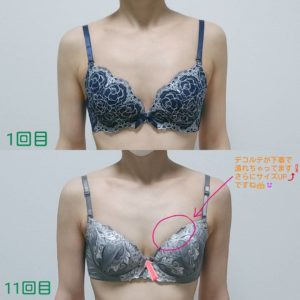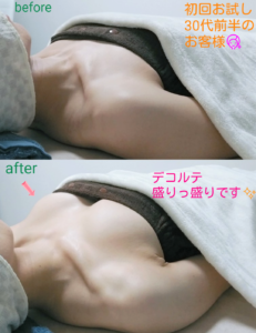 こんにちは☆今日は40代前半のモニター様のご紹介です!初回お試しと合わせて11回のお手入れが終わりました。 谷間も出来始め、デコルテがお下着で潰れちゃうほどふっくらしました!! デコルテのふ