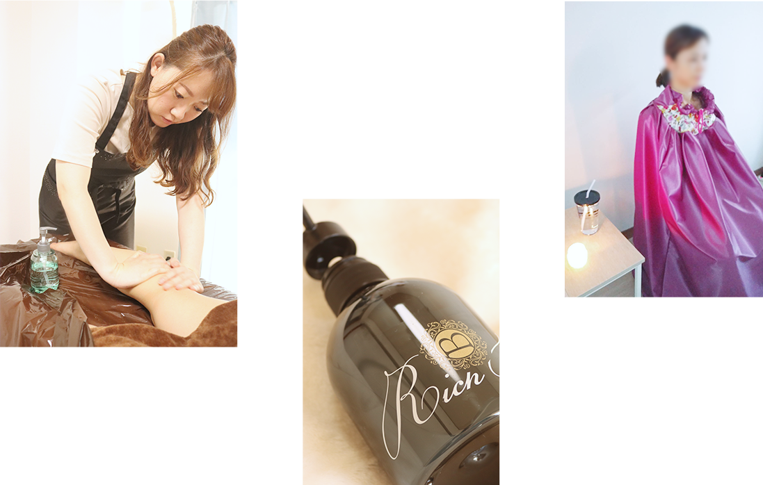 当サロンはバストケアに特化した「ミラクルバストプレミアム」や ボディメイク用ジェル「Rich Bon」を使用しています。 気持ちの良いハンドマッサージと最新マシンで 若々しいふわふわバストへと導きます。 また美しいバストへといった美容だけでなく、 筋肉を緩めリラックスしていただく、健康美容としてもおすすめ。 その他にも最近話題の脳洗浄メニューもご用意しています。